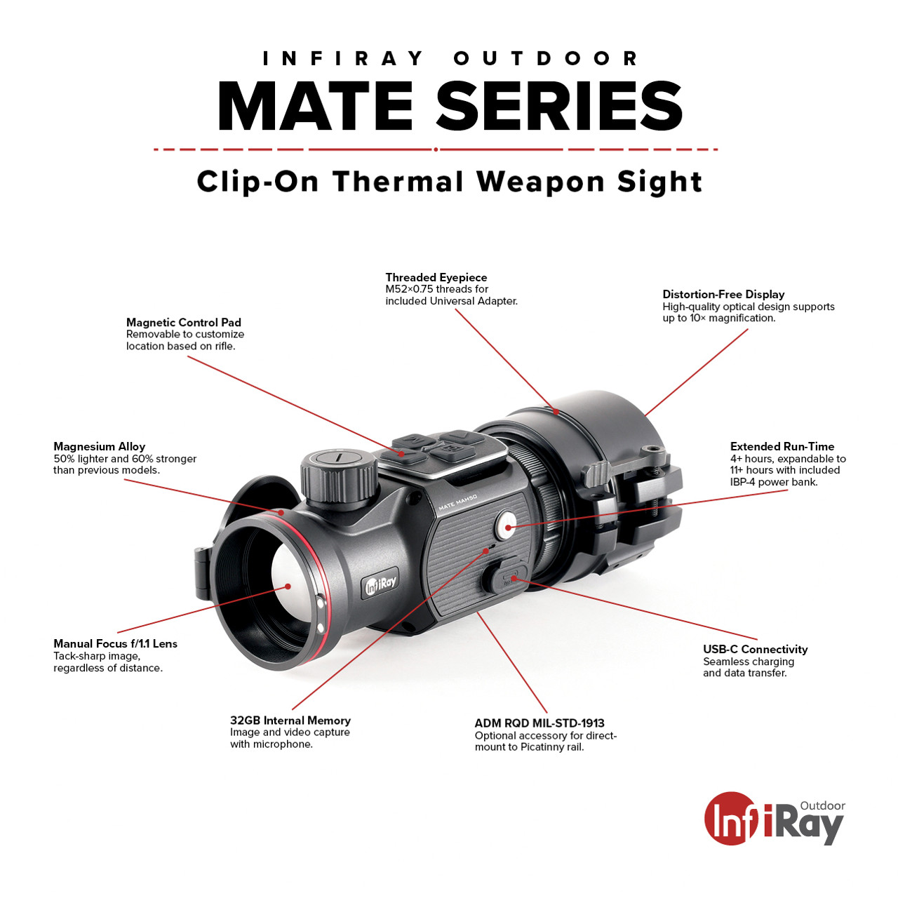 The InfiRay Outdoor MATE Series thermal clip-on brings an all-new level of versatility to your existingday scope. With a high-performance 12 μm detector, magnesium alloy housing, distortion-free display, and removable control pad, the MATE series ensures a precise and repeatable transition when dayturns to night. The MATE can be mounted directly to the objective of your day scope or be attached via MIL-STD-1913 Picatinny rail.